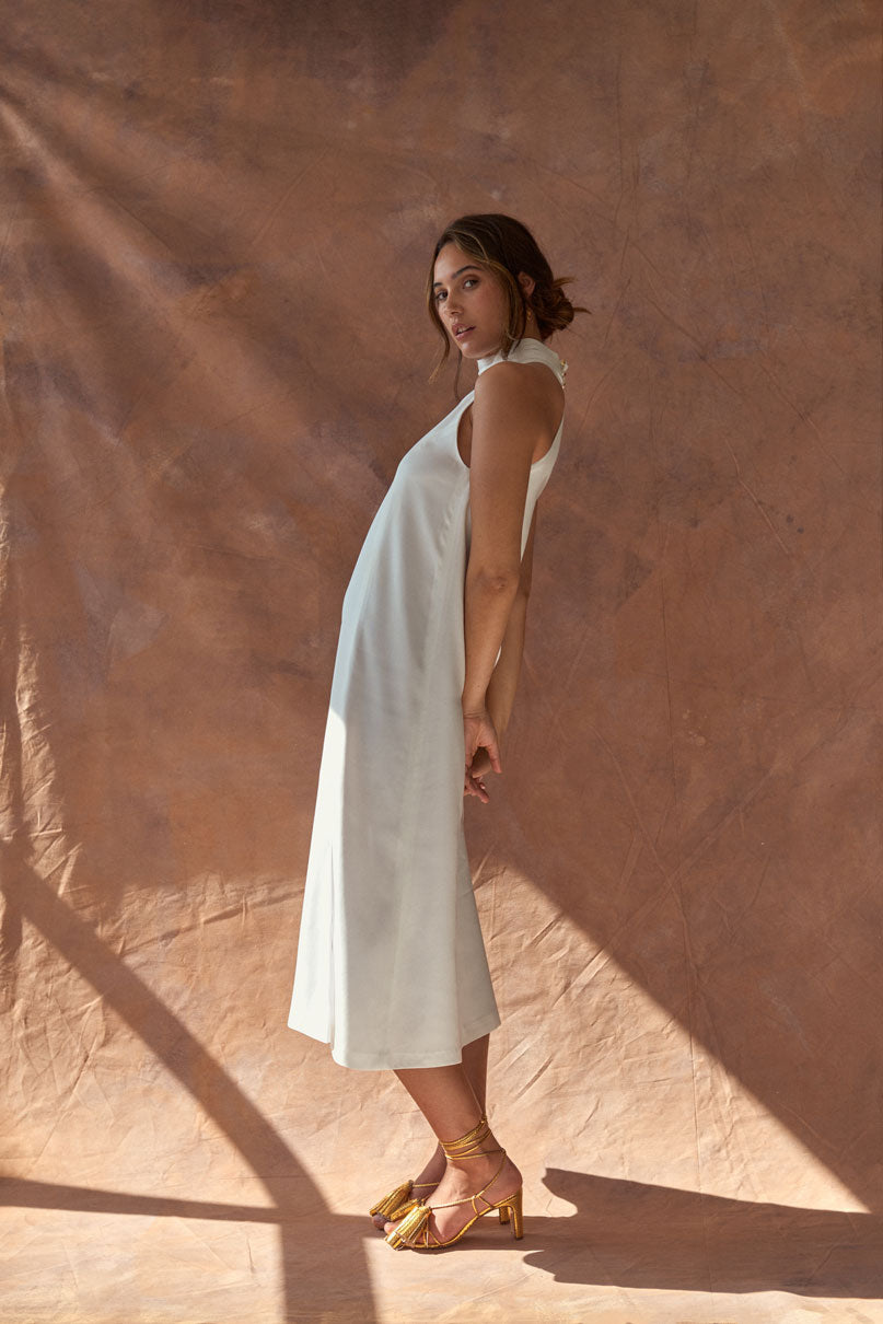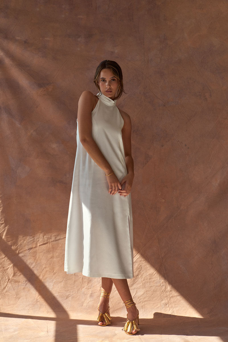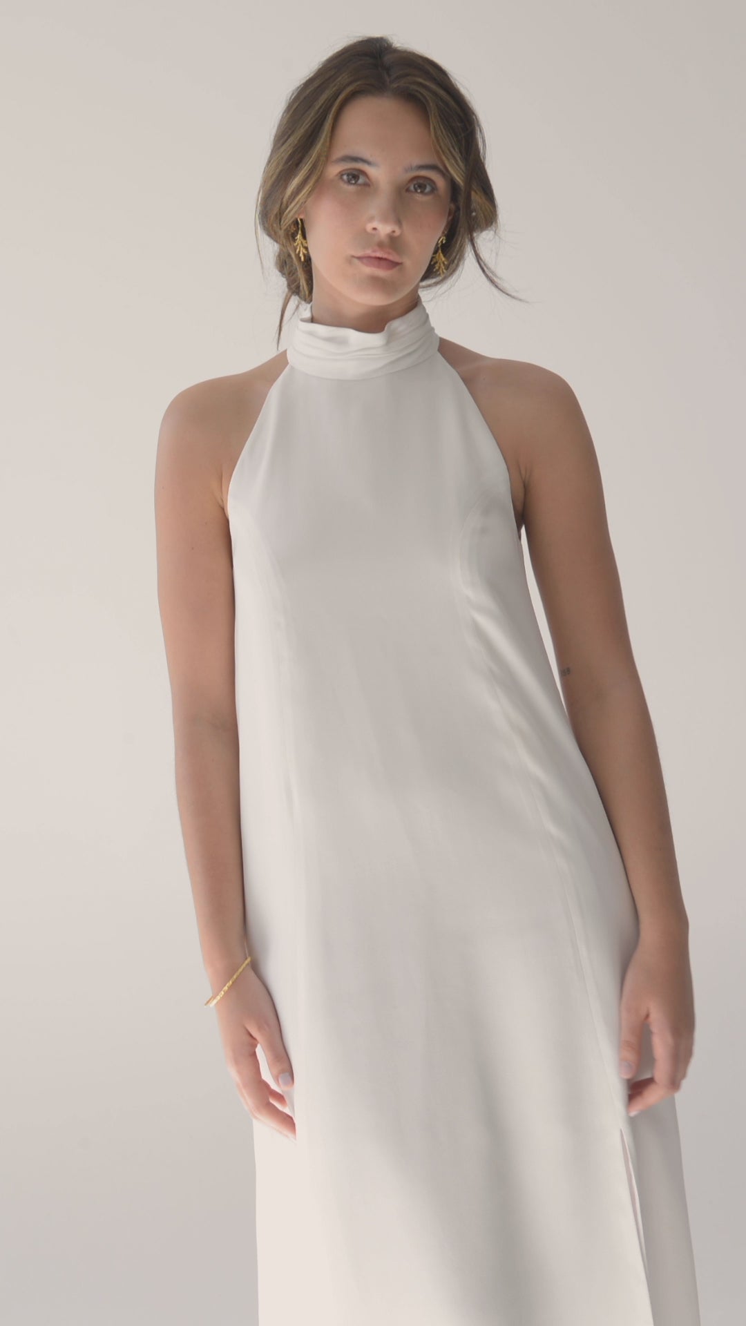 Corte en A. Cuello halter. Sin mangas. Largo midi. Cierre trasero con tres botones en el cuello. Abertura en la pierna izquierda.