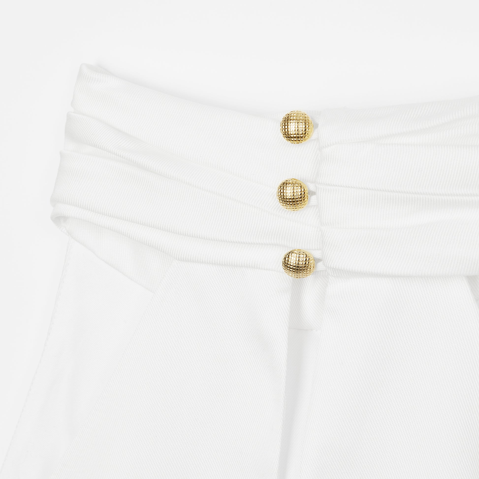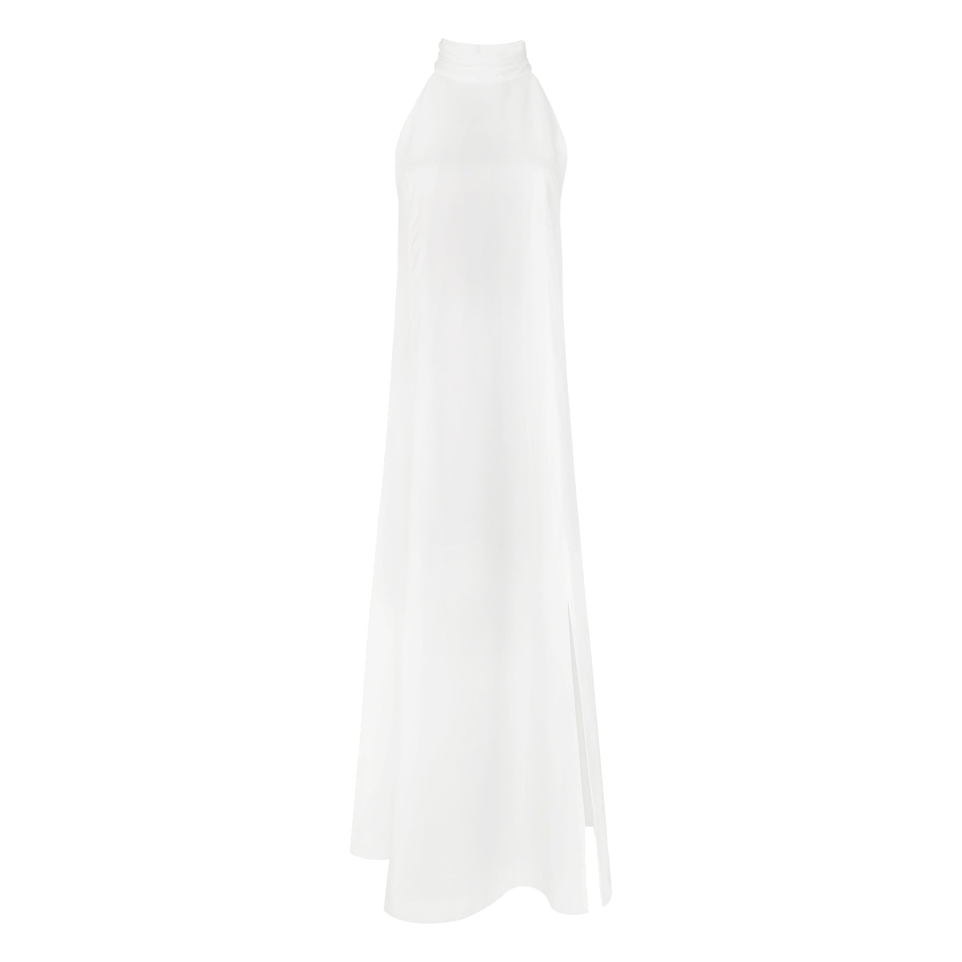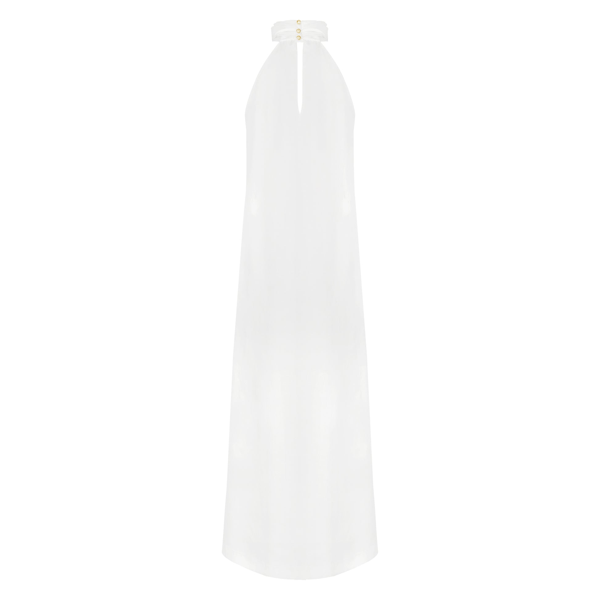 Corte en A. Cuello halter. Sin mangas. Largo midi. Cierre trasero con tres botones en el cuello. Abertura en la pierna izquierda.
