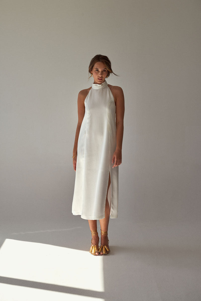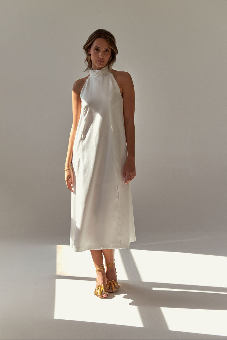 Disfruta de la elegancia y el estilo con el vestido HALO. Hecho de material sostenible y de tacto seda, este vestido favorecedor te ayudará a destacar en esas ocasiones especiales, así sea una preboda, boda civil, evento o cena. Experimenta la belleza sin sacrificar la comodidad.